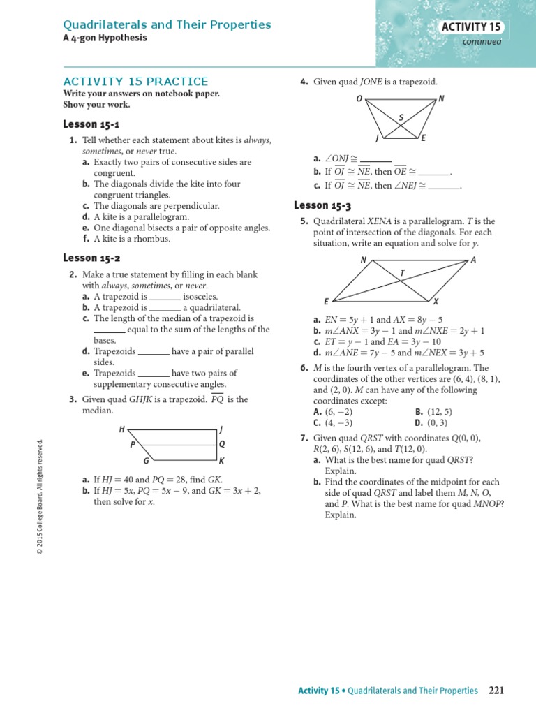 Springboard Geometry Unit 2 Activity 15 Quadrilaterals And Their Properties Flashcards Quizlet